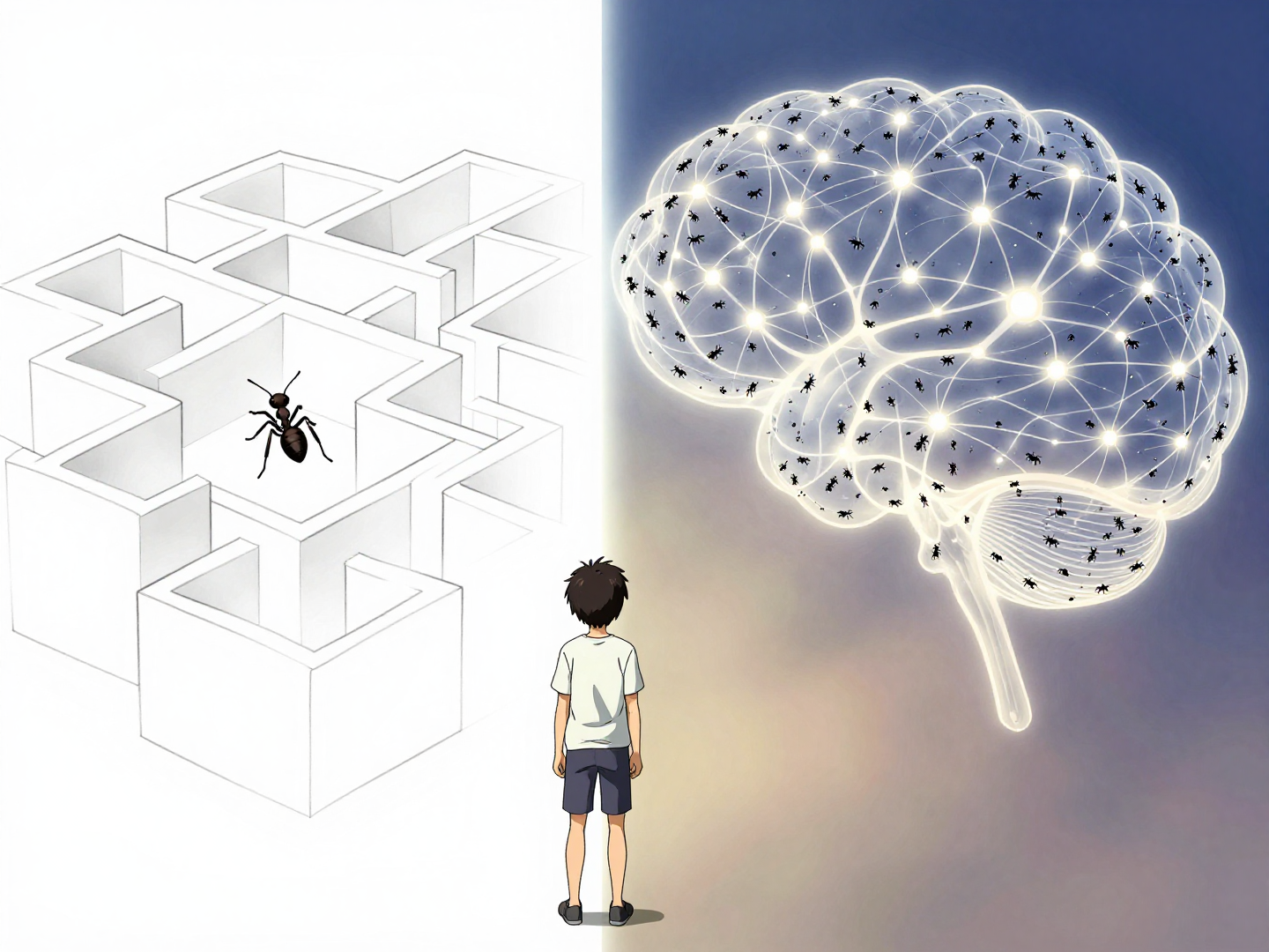 不是“搞不定”,是“不适合用还原论去搞”。你想过没有,为什么一只蚂蚁拿出来看,笨得可怜,就知道分泌点信息素,但一群蚂蚁凑在一起,就能建出宫殿一样的蚁穴?有防洪通道,有育婴室,有储藏室,甚至还给蚁后留了逃生通道。谁指挥的?